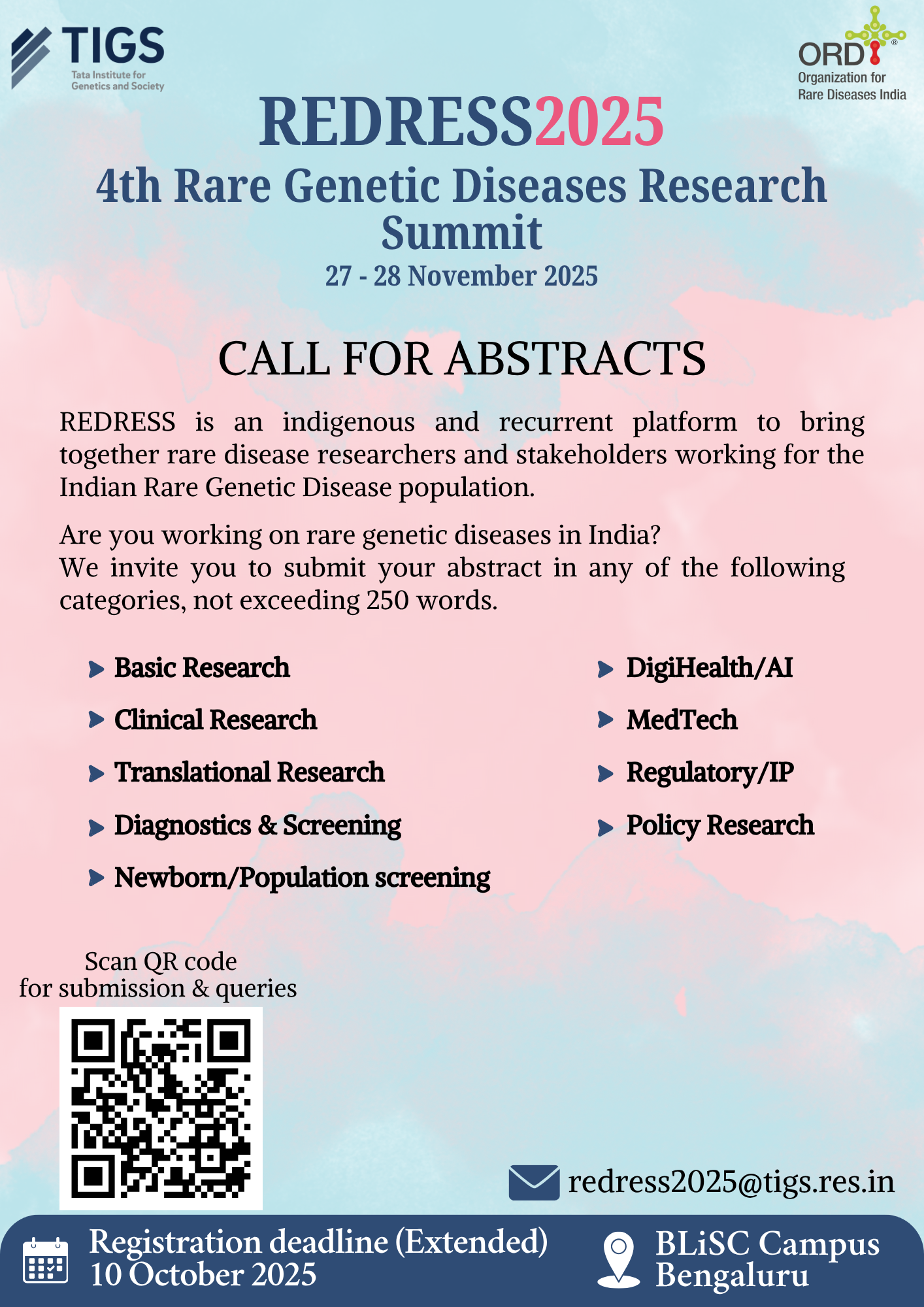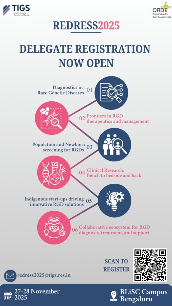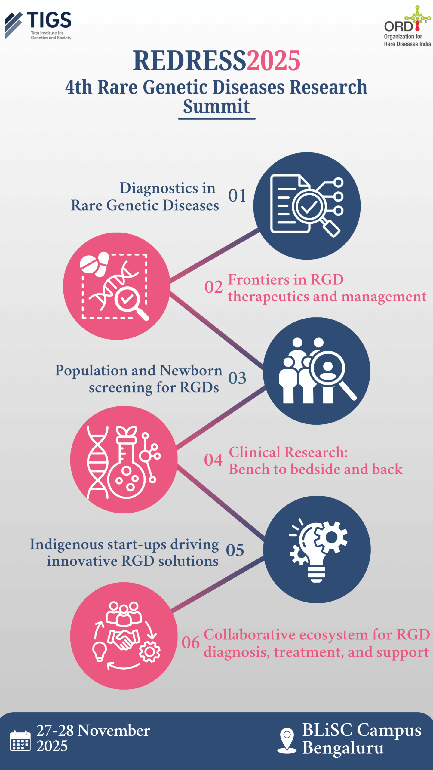 Organised by the Tata Institute for Genetics and Society (TIGS) in collaboration with the Organization for Rare Diseases India (ORDI), REDRESS 2025 builds on the momentum of its previous editions to create an even more impactful forum. This uniquely Indian platform will foster knowledge exchange, cross-sector dialogue, and sustained collaborations across the RGD ecosystem.