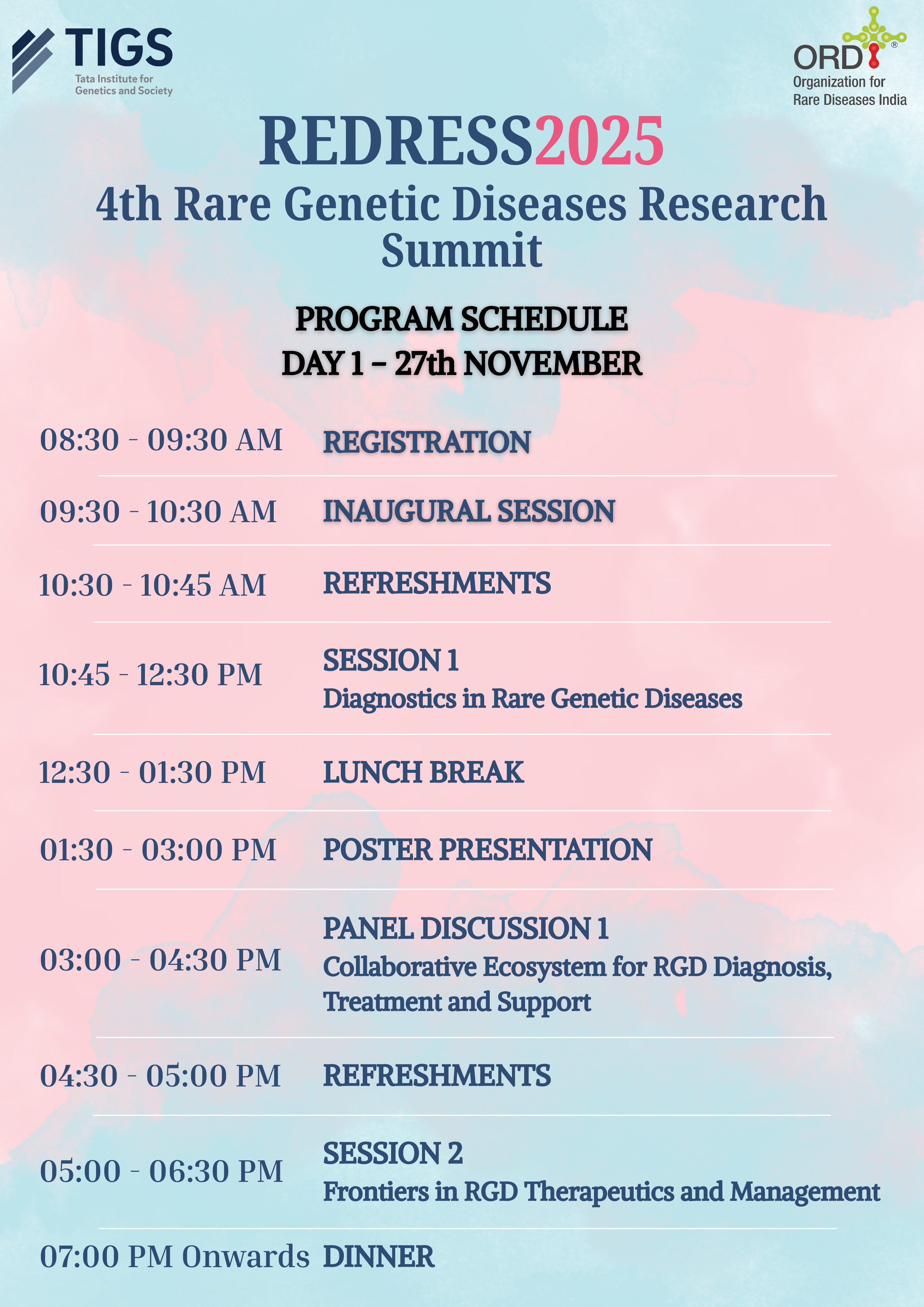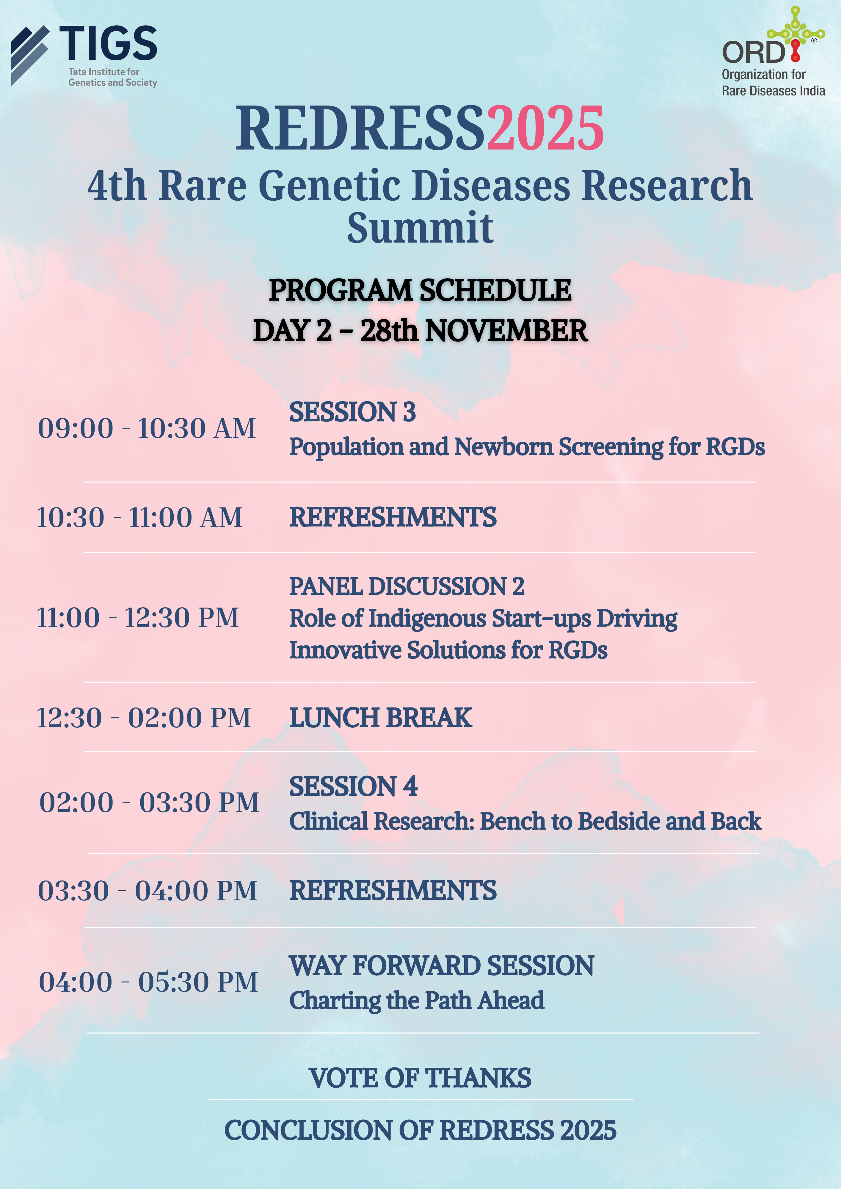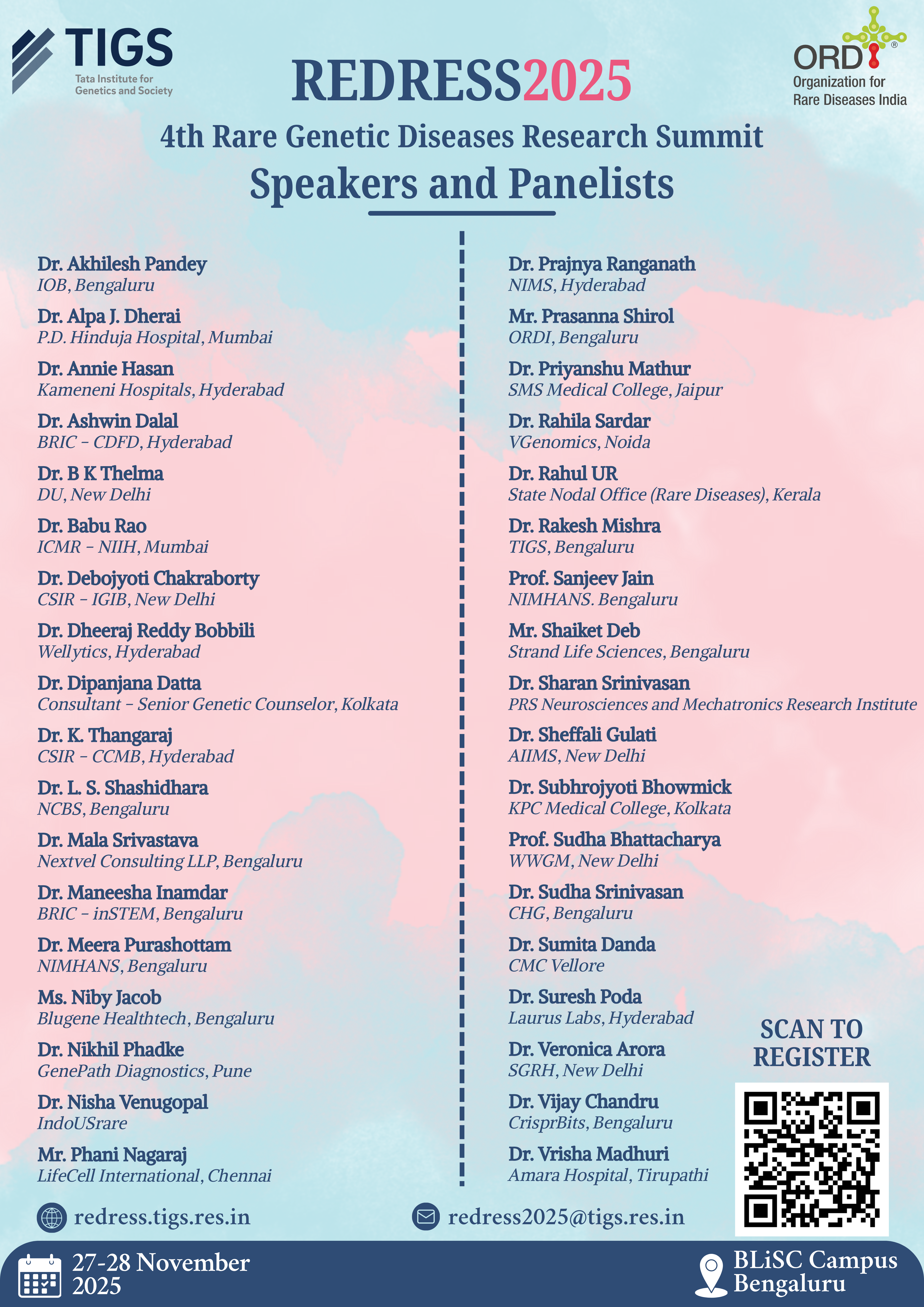 Organised by the Tata Institute for Genetics and Society (TIGS) in collaboration with the Organization for Rare Diseases India (ORDI), REDRESS 2025 builds on the momentum of its previous editions to create an even more impactful forum. This uniquely Indian platform will foster knowledge exchange, cross-sector dialogue, and sustained collaborations across the RGD ecosystem.