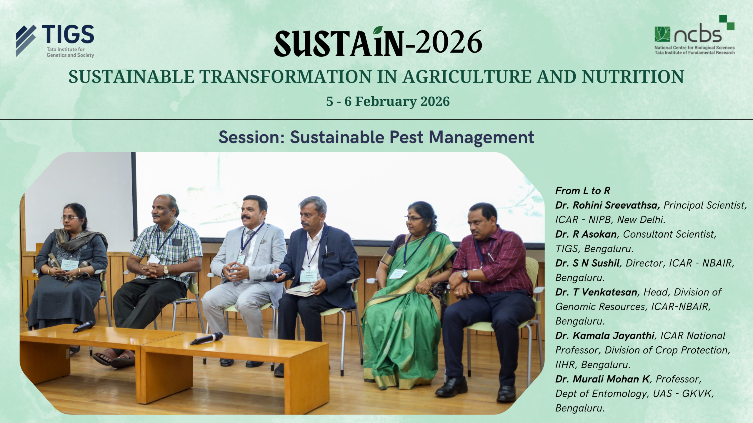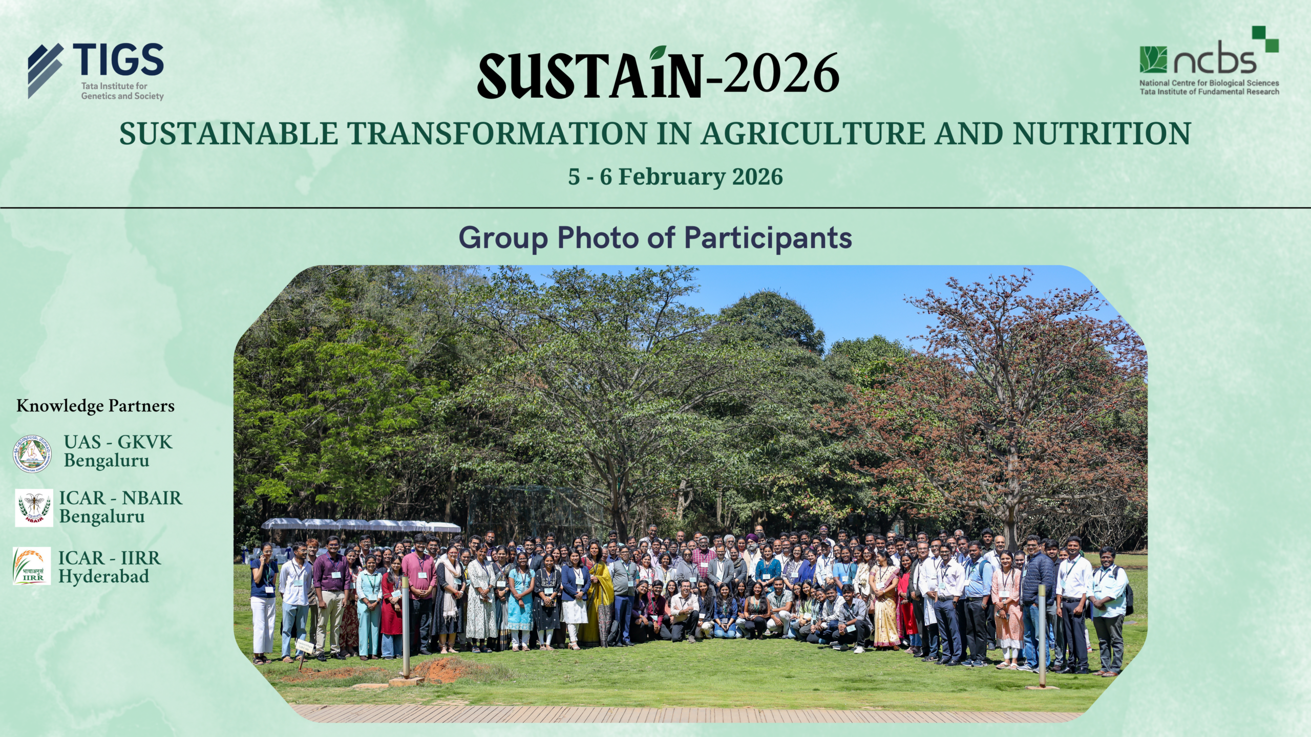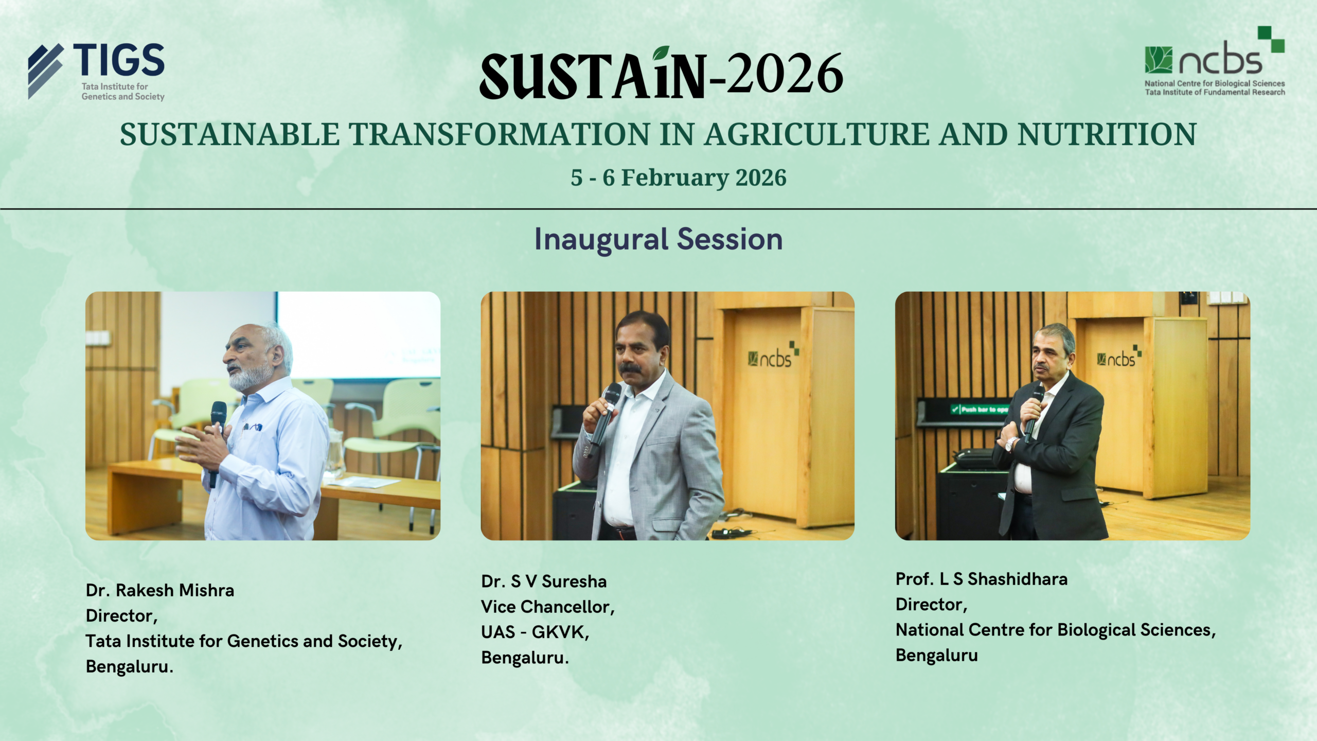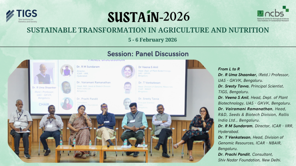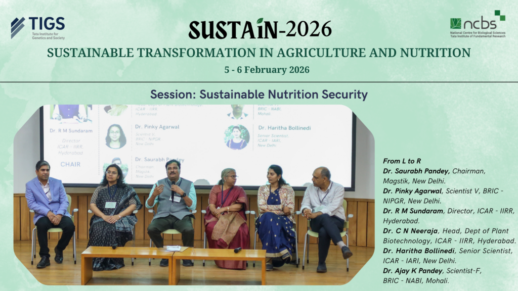 TIGS along with National Centre for Biological Sciences, Bengaluru (NCBS) successfully convened, Sustainable Transformation in Agriculture and Nutrition (SUSTAiN) – 2026 on 5–6 February at the BLiSC campus. The two-day meeting brought together researchers, industry representatives, policymakers, and students to exchange ideas and explore collaborative approaches for advancing sustainable and equitable agriculture.