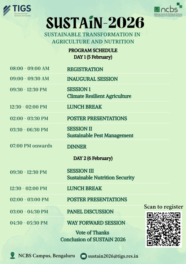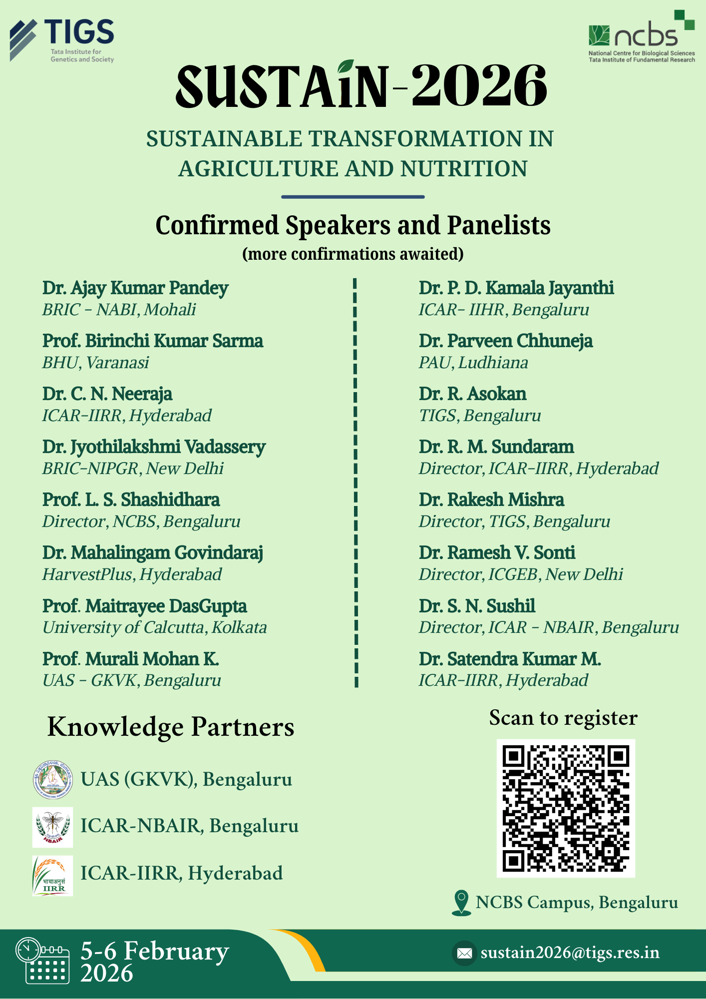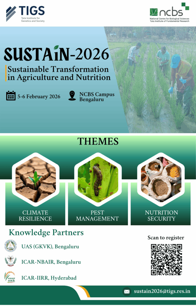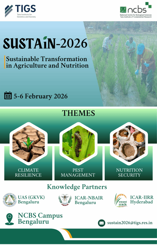 Sustainable Transformation in Agriculture and Nutrition Summit (SUSTAiN) 2026 is a new initiative launched by the Tata Institute for Genetics and Society (TIGS) in collaboration with the National Centre for Biological Sciences (NCBS). It serves as a national platform to bring together researchers, policymakers, startups, and industry leaders to accelerate crop improvement. The program fosters dialogue and partnerships around climate-resilient agriculture, advanced pest management, and improved nutrition.