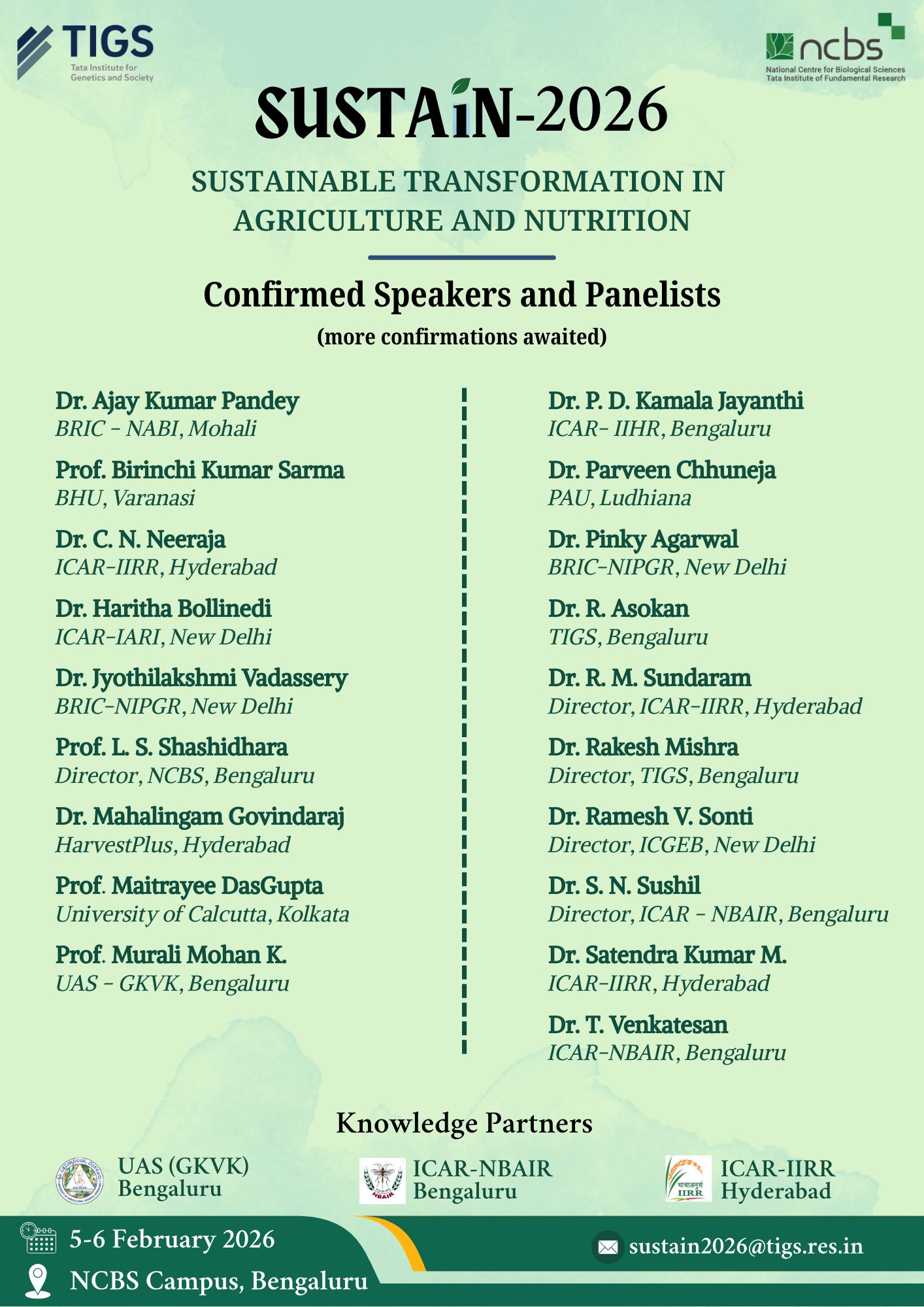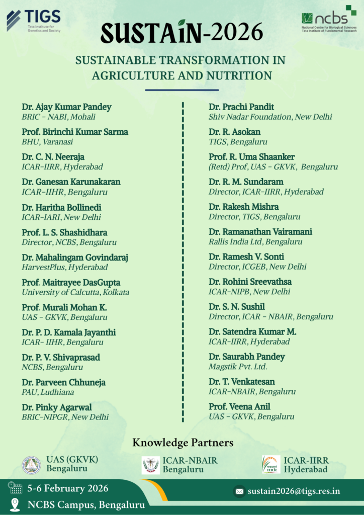 Sustainable Transformation in Agriculture and Nutrition Summit (SUSTAiN) 2026 is a new flagship initiative launched by the Tata Institute for Genetics and Society (TIGS) in collaboration with the National Centre for Biological Sciences (NCBS). It serves as a national platform to bring together researchers, policymakers, startups, and industry leaders to accelerate crop improvement. The program fosters dialogue and partnerships around climate-resilient agriculture, advanced pest management, and improved nutrition.