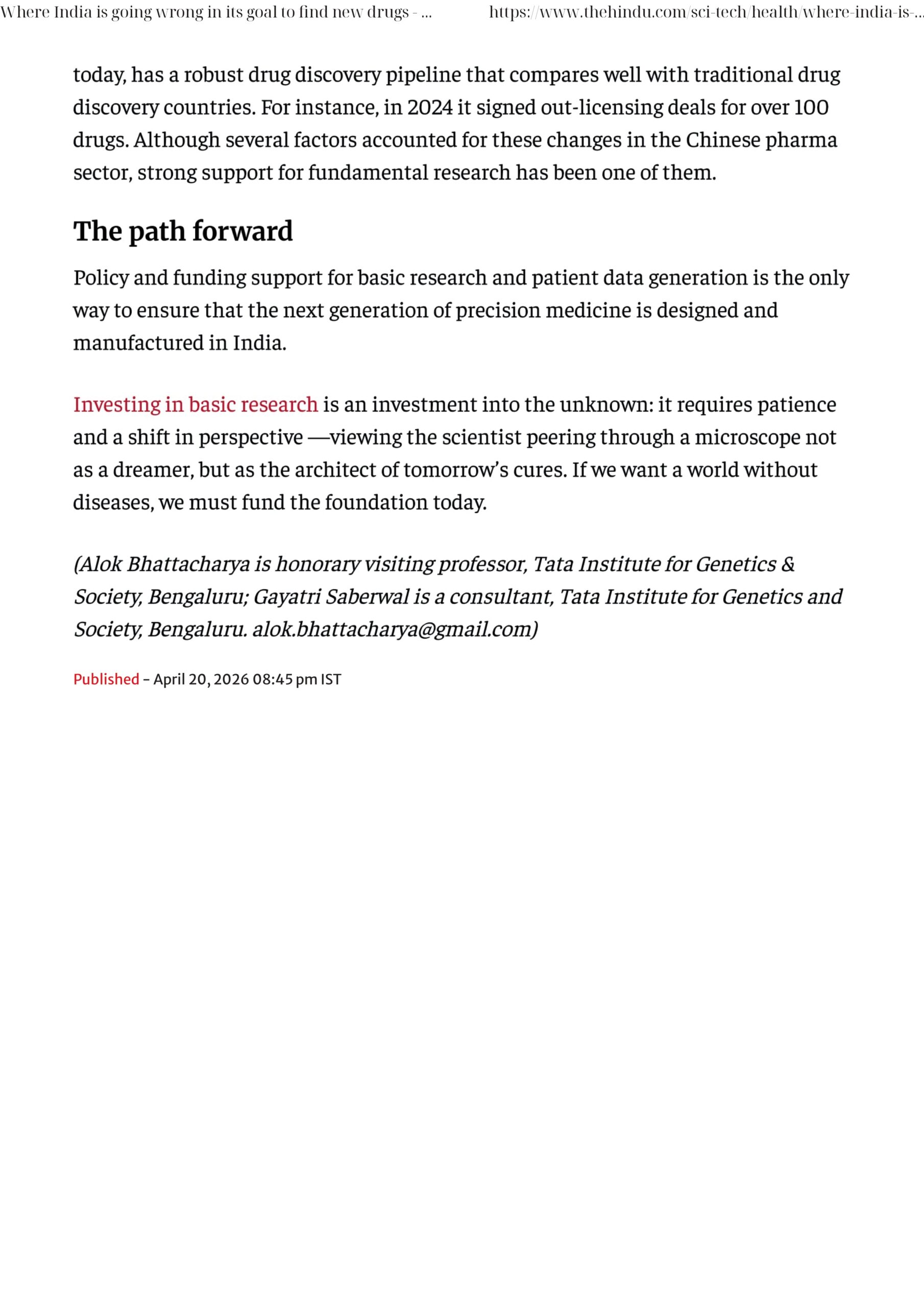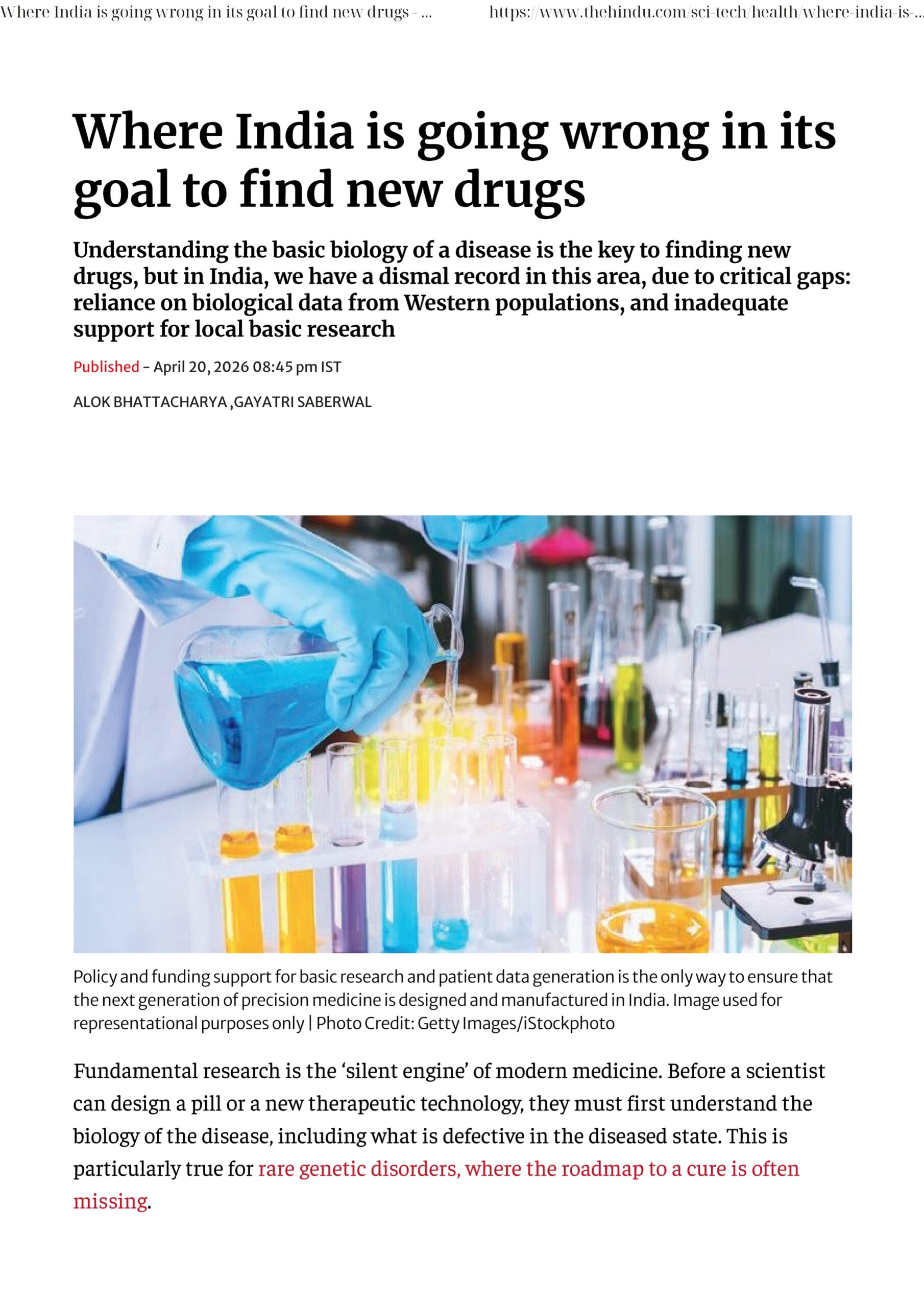 This recent article by Prof. Alok Bhattacharya and Dr. Gayatri Saberwal in The Hindu highlights a critical gap: without strong investment in basic science and India-specific patient data, true innovation will remain out of reach. From rare diseases to precision medicine, breakthroughs begin with understanding biology, not just manufacturing solutions.